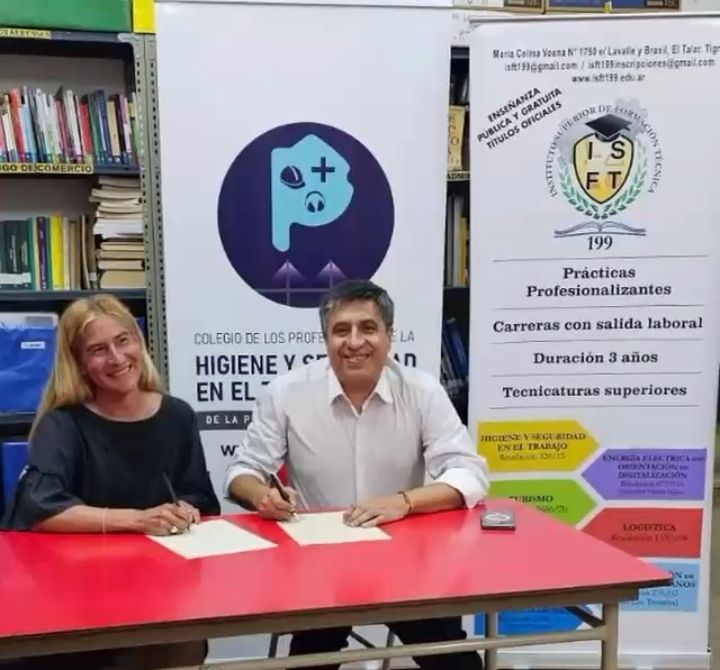 En el marco del programa “Mi Primer Matricula Digital” el Colegio de Profesionales de Higiene y Seguridad de la Provincia de Buenos Aires, representado por su Presidente, el Lic. Lorenzo Gómez, firmó un acta acuerdo con el Instituto Superior de Formación Técnica Nº199 a cargo de su directora la Prof. María Laura Ruiz.