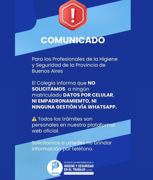 El Colegio de Profesionales de la Higiene y Seguridad en el Trabajo de la Provincia de Buenos Aires informa que no realiza llamados telefónicos ni solicita datos personales por WhatsApp o celular.