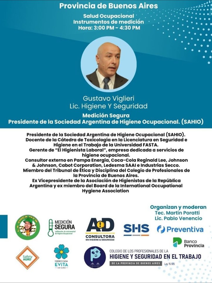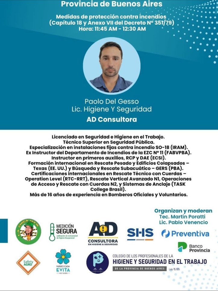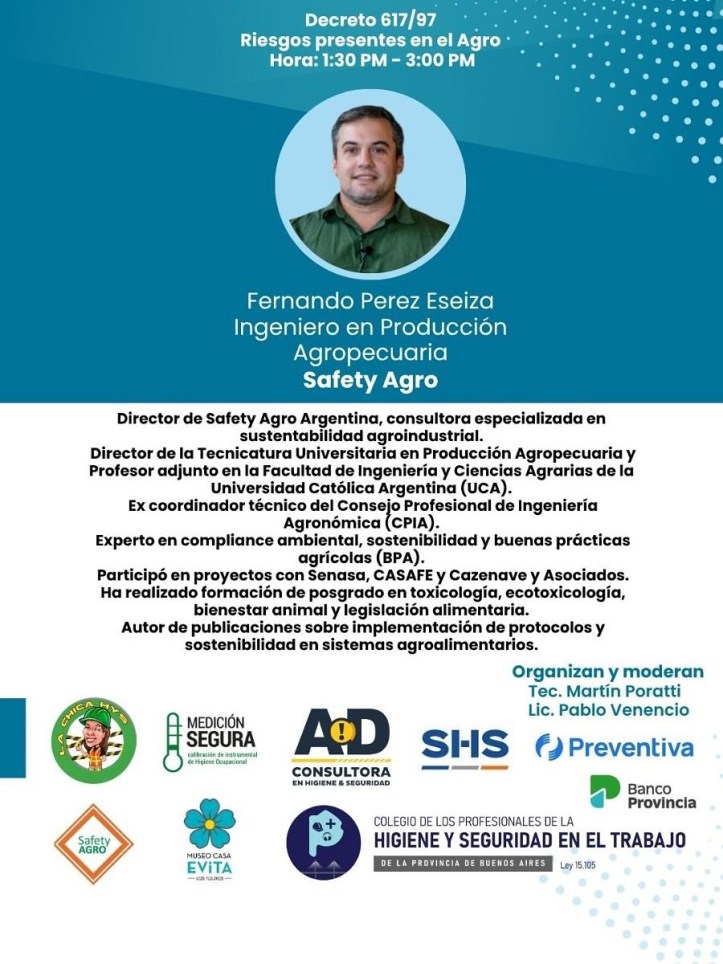 Durante la jornada disertarán especialistas de reconocida trayectoria: Diego De Francesco y Paolo Del Gesso (AD Consultora); Fernando Pérez Ezeiza (Safety Agro); Gustavo Viglieri (SAHIO); y Lorenzo Gómez, presidente del Colegio de Profesionales de la Higiene y la Seguridad en el Trabajo de la Provincia de Buenos Aires.