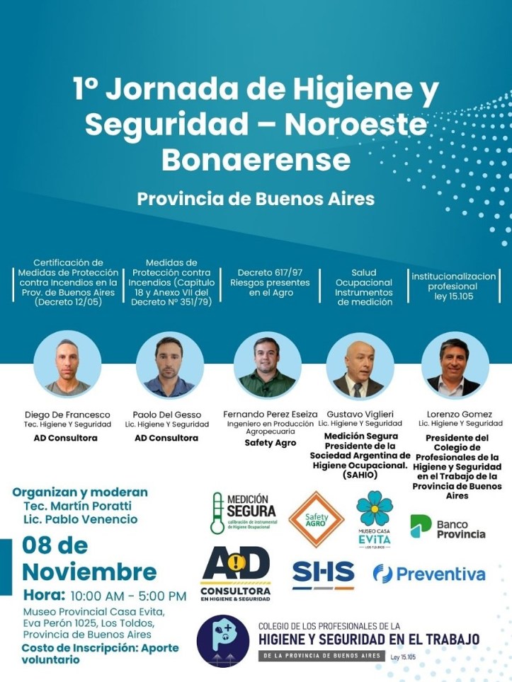 El próximo viernes 8 de noviembre se llevará a cabo la Primera Jornada de Higiene y Seguridad del Noroeste Bonaerense en el Museo Provincial Casa Evita, en la ciudad de Los Toldos, Provincia de Buenos Aires. La actividad se desarrollará de 10 a 17 horas y reunirá a profesionales, docentes y referentes del sector con el objetivo de fortalecer la prevención, la profesionalización y el compromiso con la Ley 15.105.