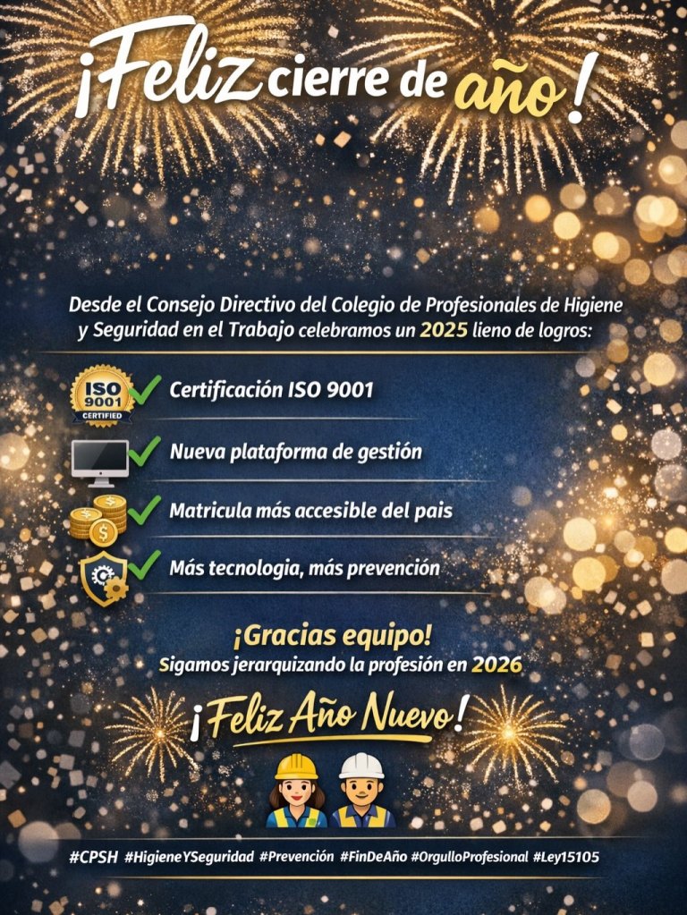 Desde el Consejo Directivo del Colegio de Profesionales de Higiene y Seguridad en el Trabajo de la Provincia de Buenos Aires queremos agradecer profundamente a cada uno de los matriculados, colaboradores y equipos de trabajo que hicieron posible otro año de crecimiento, compromiso y profesionalismo.
