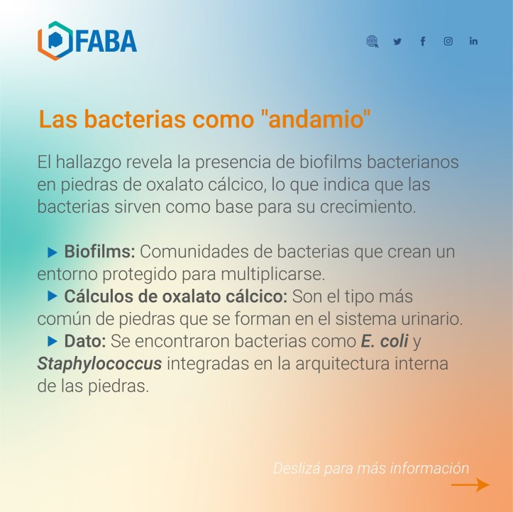 Un estudio publicado en PNAS reveló que ciertos microorganismos pueden participar activamente en la formación de cálculos renales. Investigadores de la UCLA identificaron biofilms bacterianos integrados en piedras de oxalato cálcico, lo que sugiere que las bacterias podrían actuar como una base para su crecimiento.