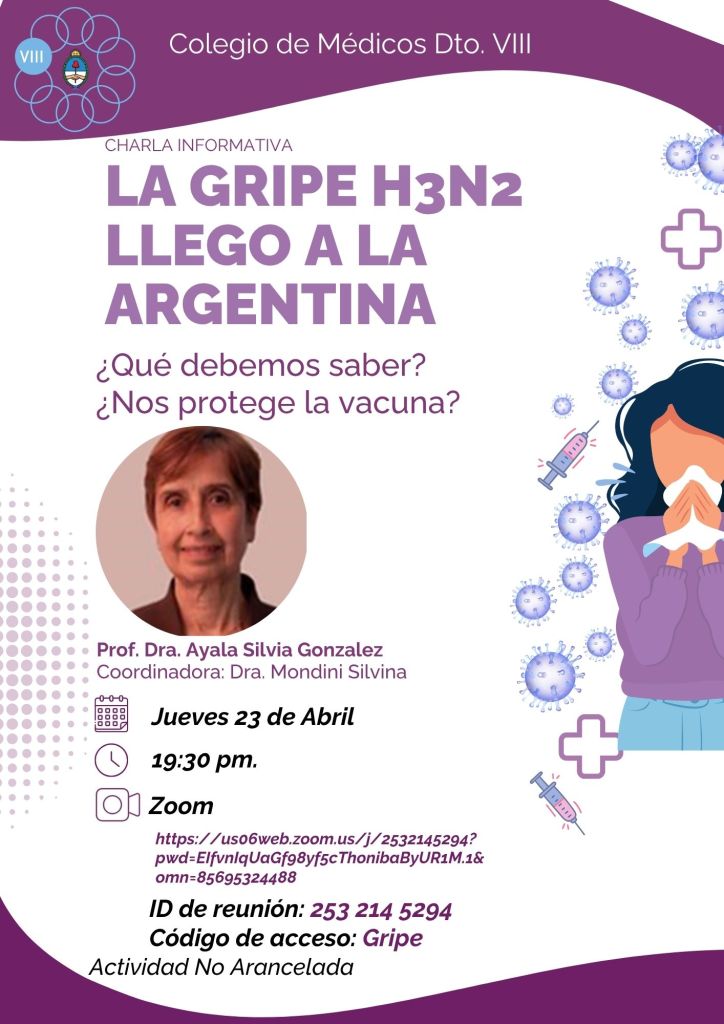 El Colegio de Médicos de la Provincia de Buenos Aires, Distrito I, invita a sus matriculados a la Charla Informativa sobre la gripe H3 N2. La actividad estará a cargo de la Dra. Silvia González Ayala.