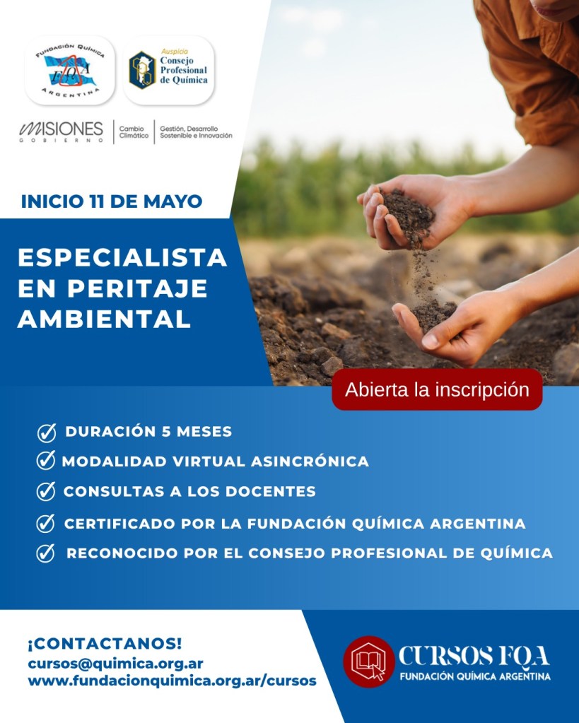 Para mas info e inscripción, visitar: https://fundacionquimica.org.ar/cursos/cursos/especializacion-en-peritaje-ambiental/