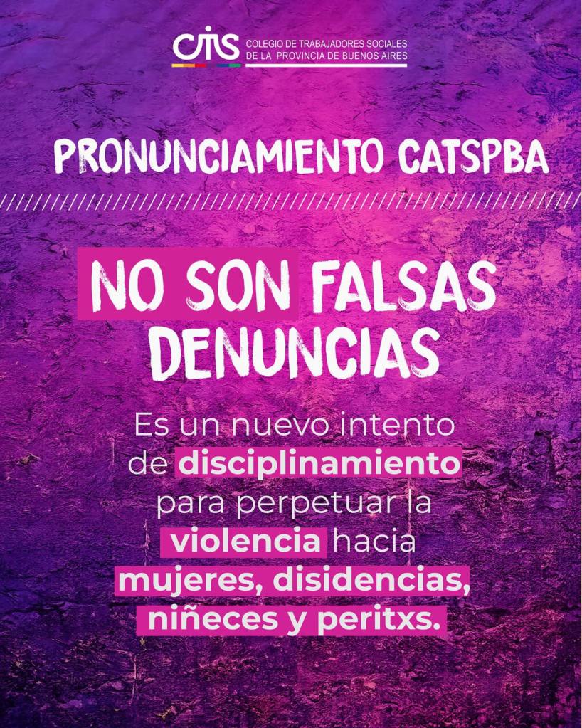 Desde el CATSPBA expresamos nuestro rechazo y preocupación ante el Proyecto de ley para sancionar “Falsas Denuncias” -que ya obtuvo dictamen de Comisión en el Senado Nacional-, por ser un ataque directo y una forma más de disciplinamiento hacia las mujeres, disidencias y niñeces que denuncian situaciones de violencia -especialmente violencias sexuales-, así como hacia integrantes de los Equipos Técnicos, en especial hacia lxs profesionales del Trabajo Social que se desempeñan como Peritxs en las distintas dependencias de la administración de justicia, especialmente en los Juzgados de Familia.