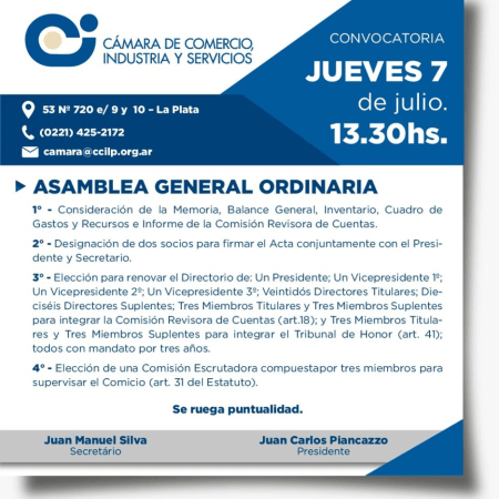 La Cámara de Comercio, Industria y Servicios llevará adelante su Asamblea Ordinaria en La Plata