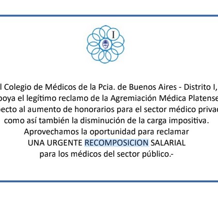 El Colegio de Médicos Distrito I manifestó su apoyo al reclamo de la Agremiación Médica Platense