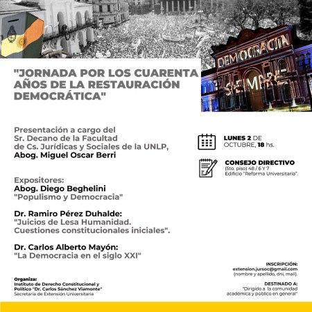 La Facultad de Ciencias Jurídicas de la UNLP invita a la «Jornada por los cuarenta años de la restauración democrática»