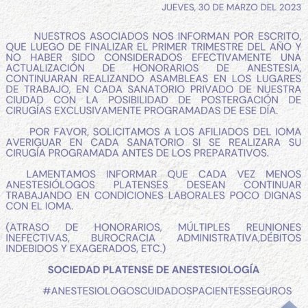 Ante el atraso de honorarios y débitos indebidos, anestesiólogos de La Plata continúan en conflicto con IOMA