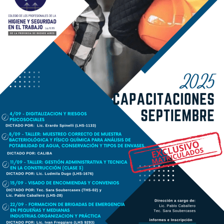 El Colegio de Profesionales de Higiene y Seguridad compartió su cronograma de capaciones para septiembre