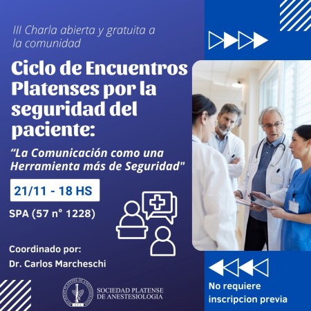 La Sociedad Platense de Anestesiología invita a una nueva charla del ciclo «Paciente Seguro»