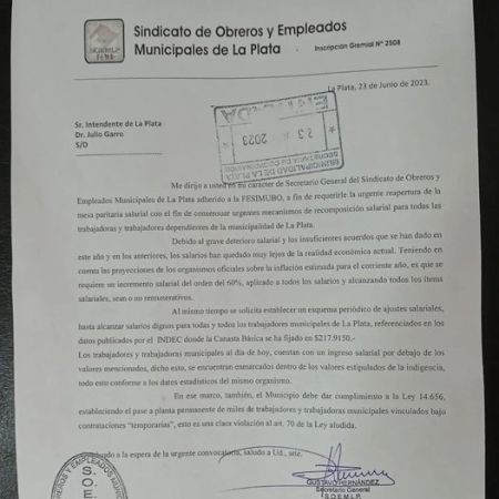 El Sindicato de Obreros y Empleados Municipales de La Plata solicitó la reapertura urgente de la mesa paritaria salarial
