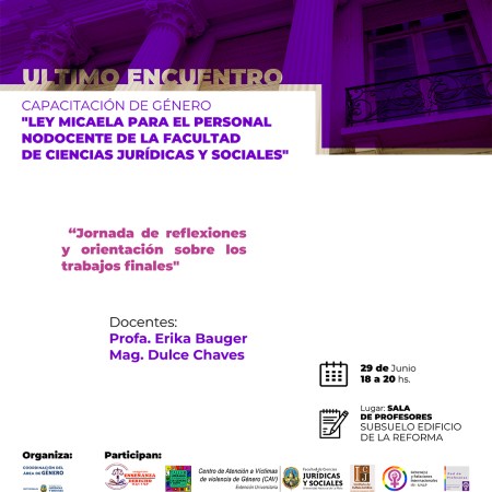Se realizará el último encuentro de la “Capacitación de Ley Micaela” para el personal nodocente de la Facultad Derecho de la UNLP