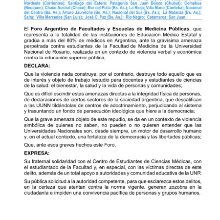El Foro Argentino de Facultades y Escuelas de Medicina Públicas, se manifestó ante la amenaza perpetrada contra estudiantes de la Universidad Nacional de Rosario